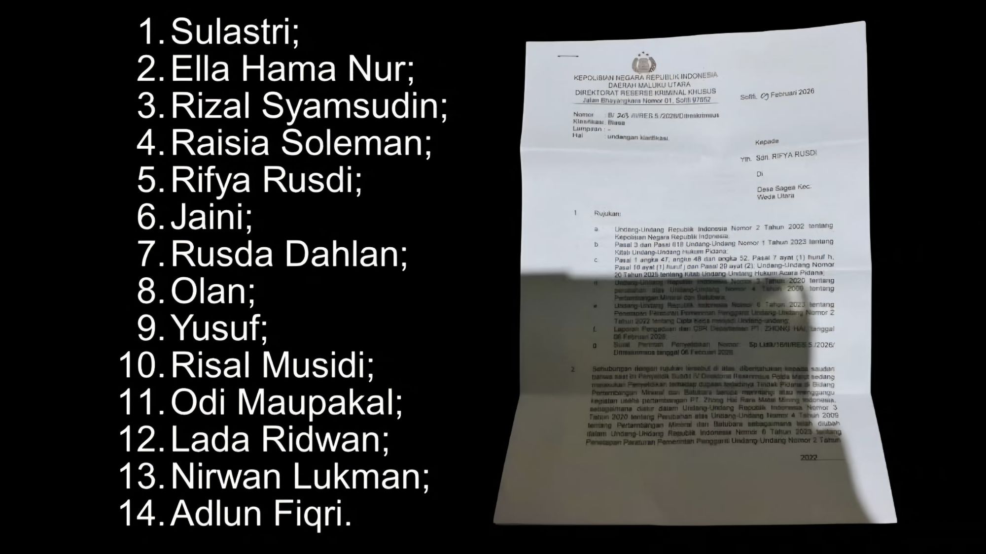 Dugaan upaya kriminalisasi kembali menyasar warga Sagea dan Kiya yang konsisten menolak aktivitas pertambangan nikel di wilayah mereka. Pada Selasa, 10 Februari 2026 malam, sebanyak 14 aktivis Save Sagea—yang juga merupakan warga Desa Sagea dan Desa Kiya, Weda Utara, Halmahera Tengah, Maluku Utara—menerima surat panggilan dari Direktorat Reserse Kriminal Khusus (Ditreskrimsus) Kepolisian Daerah (Polda) Maluku Utara.